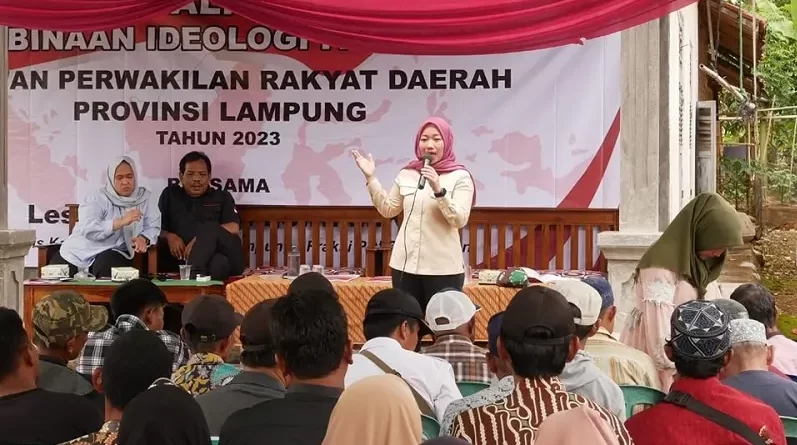 Lampung Selatan – Anggota DPRD Provinsi Lampung yang juga Wakil Ketua Bidang Koperasi dan UMKM DPD PDI Perjuangan Lampung, Lesty Putri Utami menggelar sosisalisasi pembinaan Ideologi Pancasila di Desa Karang Raja, Kecamatan Merbau Mataram, Kabupaten Lampung Selatan, Kamis (2/2/2023).