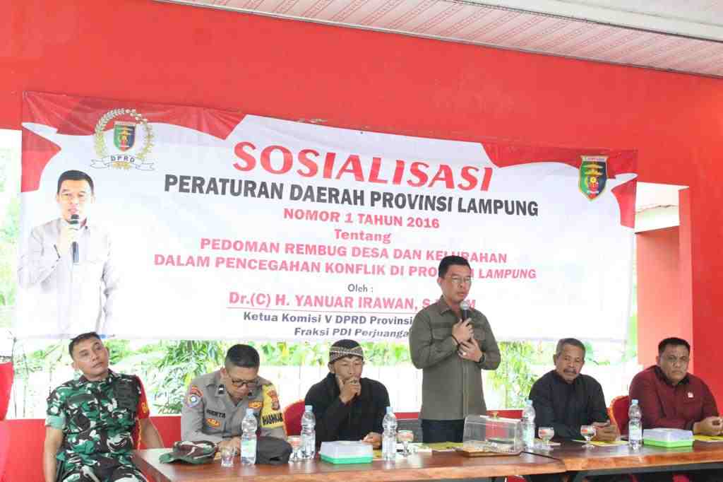 Kemudian, dalam sambutannya Anggota fraksi PDI Perjuangan DPRD Provinsi Lampung DR. (C) Hi. Yanuar Irawan, S.E., M.M menyampaikan, bahwa kegiatan sosialisasi Perda ini berguna untuk pencegahan Konflik di Provinsi Lampung.