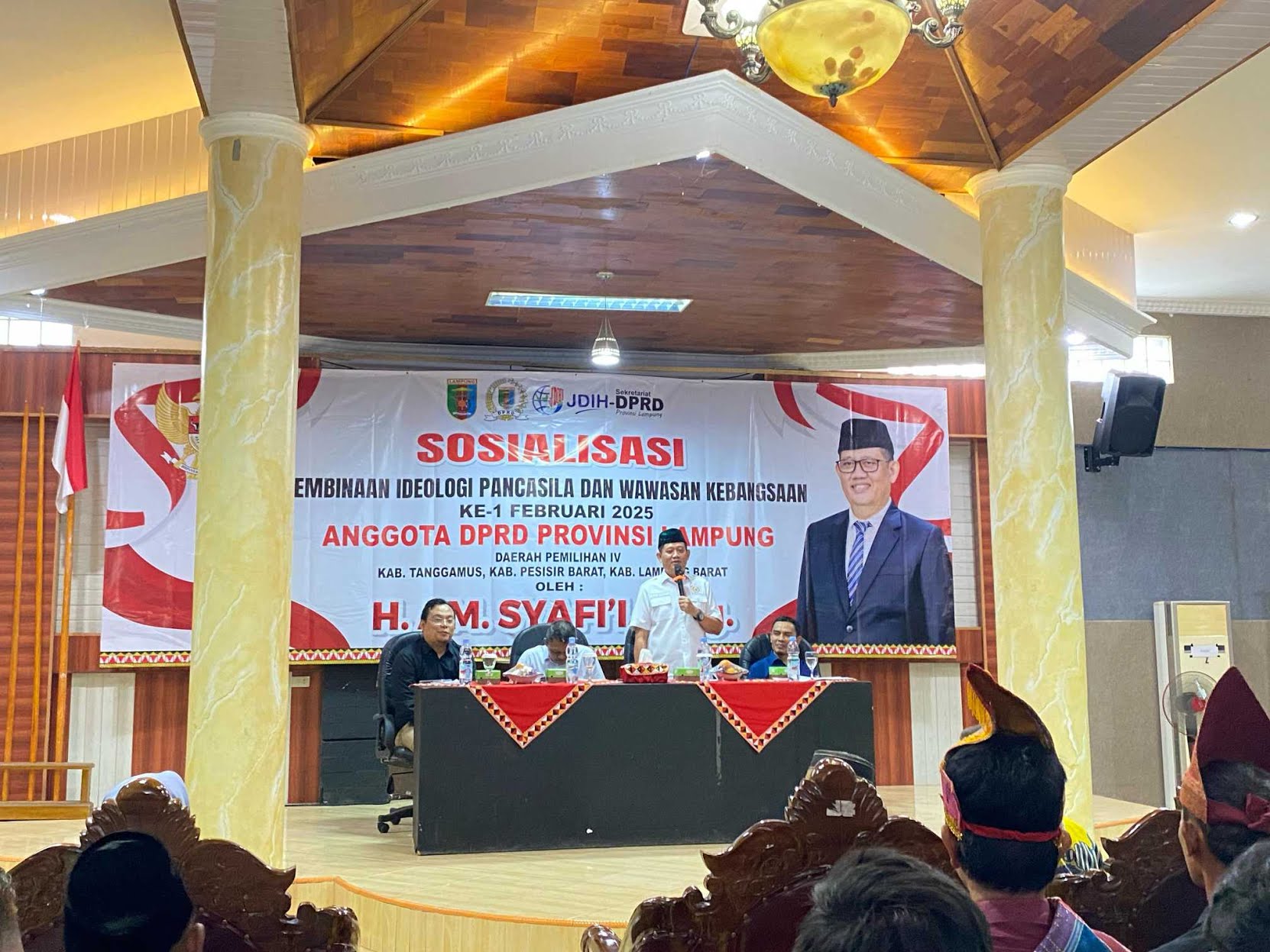 Tanggamus – Anggota DPRD Provinsi Lampung AM. Syafi’i melakukan kegiatan Sosialisasi Pembinaan Ideologi Pancasila dan Wawasan Kebangsaan di Kabupaten Tanggamus, tepatnya di Aula pertemuan Hotel 21, Kecamatan Gisting, Senin 10 Februari 2025.