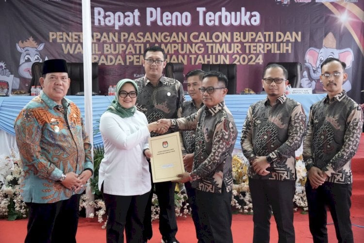 “Keputusan KPU Lampung Timur Nomor 5 tahun 2024, menetapkan pasangan calon (paslon) nomor urut 01, Ela Siti Nuryamah dan Azwar Hadi sebagai Bupati dan Wakil Bupati Lampung Timur, priode 2025-2030,” kata Dedi Maryanto, Kamis (9/1/2025)
