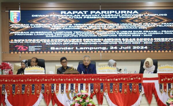 Bandar Lampung – Pj. Gubernur Lampung Samsudin menyampaikan Jawaban atas Pemandangan Umum Fraksi-fraksi DPRD Provinsi Lampung terhadap Rancangan Peraturan Daerah tentang Rencana Pembangunan Jangka Panjang Daerah (RPJPD) Provinsi Lampung Tahun 2025-2045, di Ruang Rapat Paripurna DPRD Provinsi Lampung, Rabu (24/07/2024).
