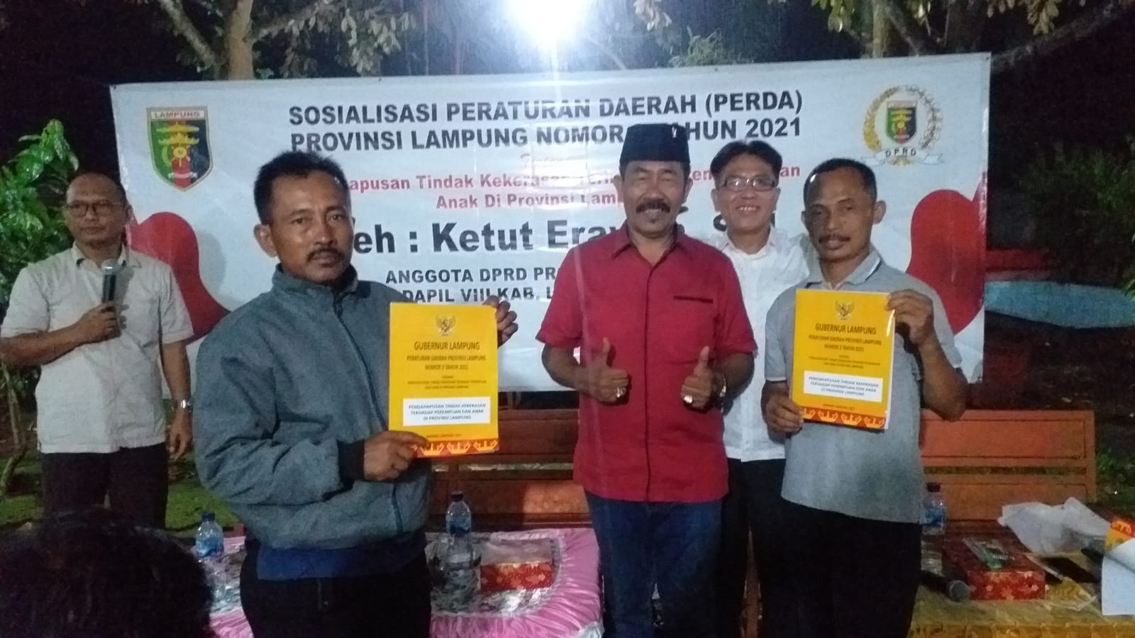 Dalam sambutan nya, Ketut yang juga anggota komisi I DPRD Provinsi Lampung ini melihat tindak kekerasan yang menimpa perempuan dan anak masih sangat tinggi. Terutama terhadap anak, maka perlu adanya pemahaman yang di berikan kepada masyarakat salah satunya melalui kegiatan sosialisasi peraturan daerah ini.