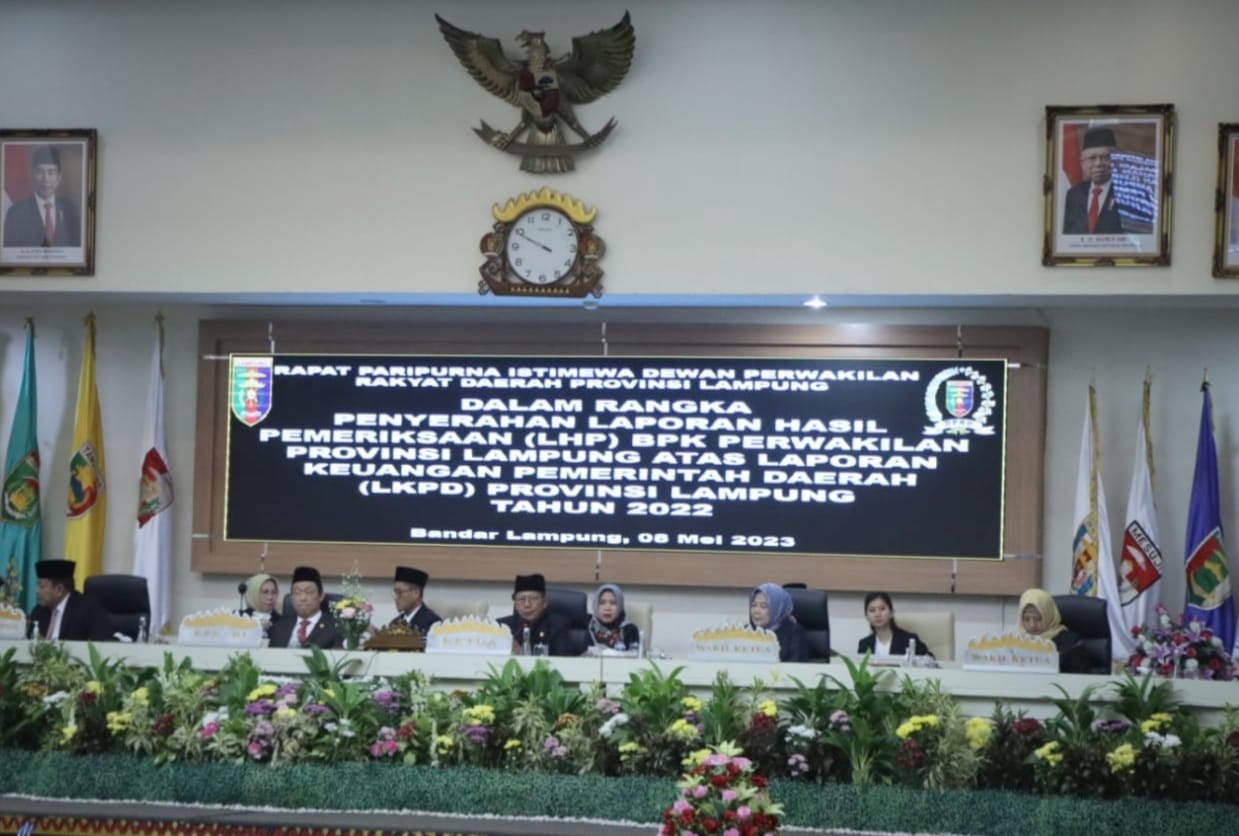 Bandar Lampung – Anggota V BPK RI selaku Pimpinan Keuangan Negara V Ir. H. Ahmadi Noor Supit menyerahkan Laporan Hasil Pemeriksaan BPK RI atas Laporan Keuangan Pemerintah Daerah (LKPD) Provinsi Lampung Tahun Anggaran 2022 kepada Gubernur Lampung yang disaksikan Ketua DPRD Provinsi Lampung dalam Rapat Paripurna Istimewa DPRD Provinsi Lampung, di Ruang Sidang DPRD Provinsi Lampung, Senin (08/05/2023).