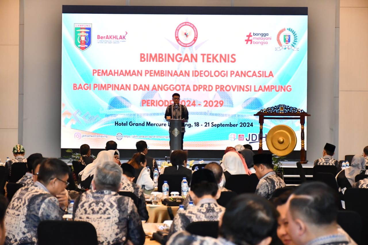 Bandar Lampung – Bimbingan Teknis (Bimtek) Pembinaan Ideologi Pancasila dan Wawasan Kebangsaan bagi pimpinan dan anggota DPRD Provinsi Lampung periode 2024 – 2029 dilaksanakan di Grand Mercure Hotel Bandar Lampung, pada 19 hingga 20 September 2024.
