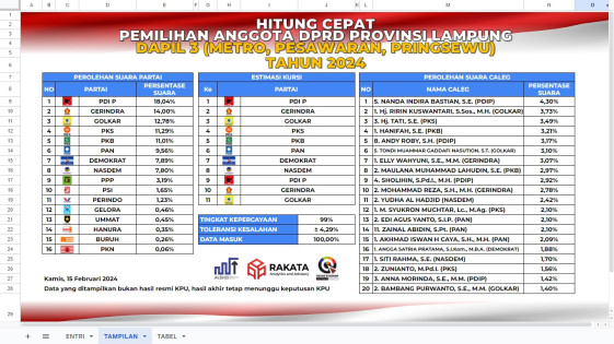 Lampumg – Lembaga Survei Rakata merilis hasil hitung cepat untuk Pemilihan DPRD Provinsi Lampung Dapil 3 pada Pemilu 2024, Kamis (15/2/2024).