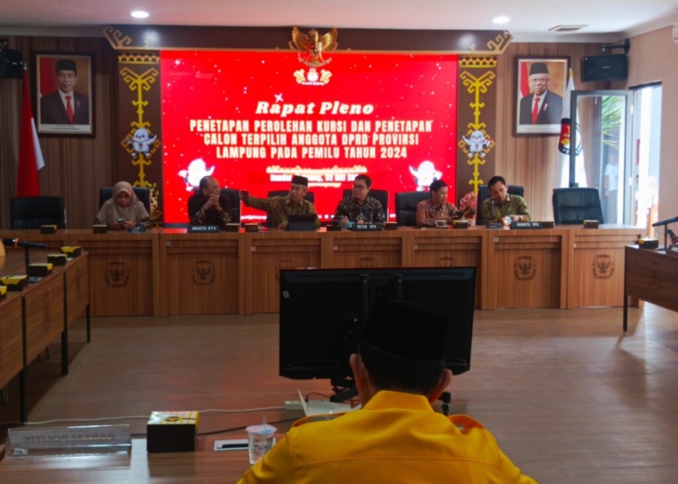 Bandar Lampung – KPU Provinsi Lampung resmi menetapkan 85 calon anggota legsilatif (caleg) DPRD Provinsi Lampung periode 2024–2029. Penetapan itu usai rapat pleno perolehan kursi dan penetapan calon terpilih, di KPU Lampung, Kamis, 2 Mei 2024.